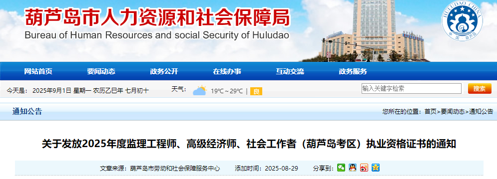 關于發(fā)放2025年度監(jiān)理工程師、高級經(jīng)濟師、社會工作者(葫蘆島考區(qū))執(zhí)業(yè)資格證書的通知