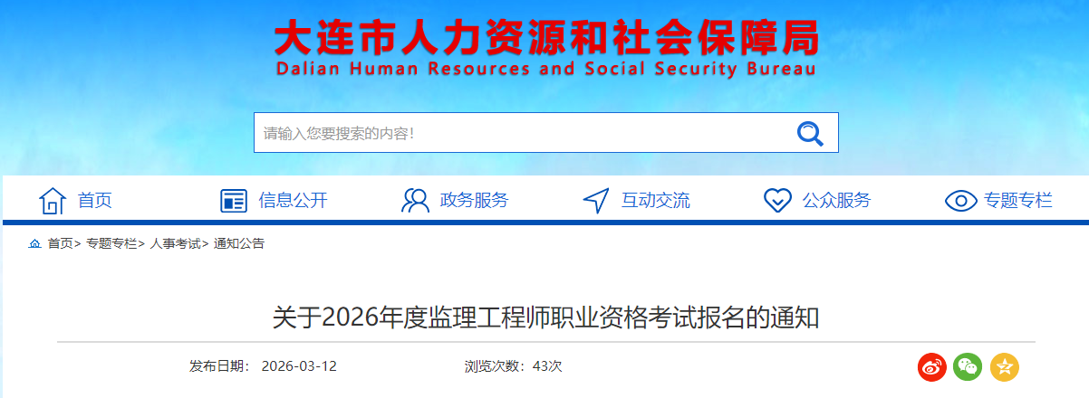 根據(jù)人力資源和社會保障部人事考試中心《關(guān)于2026年度監(jiān)理工程師職業(yè)資格考試考務(wù)工作的通知》(人考中心函〔2026〕3號)精神,為做好大連市2026年度監(jiān)理工程師職業(yè)資格考試工作,現(xiàn)將有關(guān)事項通知如下: