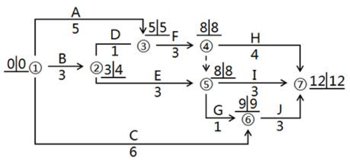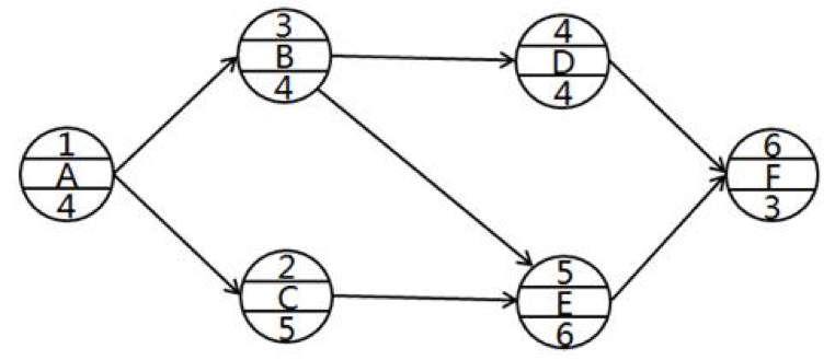 【解析】本題考查的是節(jié)點(diǎn)法。選項(xiàng)A錯(cuò)誤,選項(xiàng)B正確,關(guān)鍵線路有1-3-4-5-6-7、1-3-4-7兩條;選項(xiàng)C正確,TFE=本工作的最遲完成時(shí)間-本工作的最早完成時(shí)間=8-(3+3)=2(天);選項(xiàng)D正確,F(xiàn)FE=緊后工作的最早開始時(shí)間-本工作的最早完成時(shí)間=8-(3+3)=2(天);選項(xiàng)E錯(cuò)誤,工作C為非關(guān)鍵工作。參見教材P50。