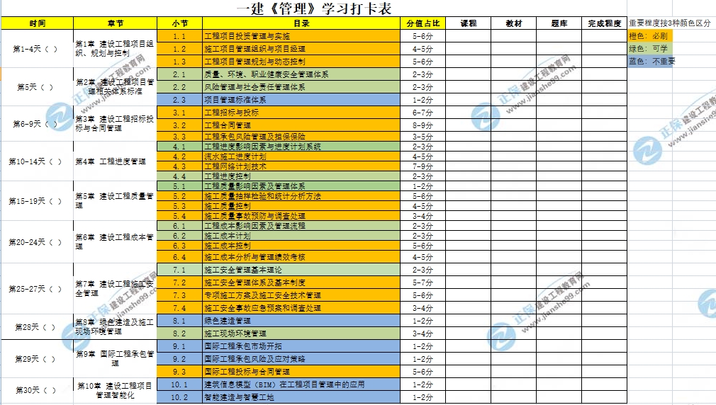 如果你今年也是一建報考的一份子,就將這份打卡表打印下來,監(jiān)督自己,自律備考,今年別做一建的陪跑者~