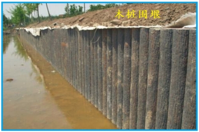 3.木樁竹條土圍堰:利用木樁(松木使用較多)及打入水中形成排式擋水結(jié)構(gòu),一側(cè)填土來進(jìn)行過止水。