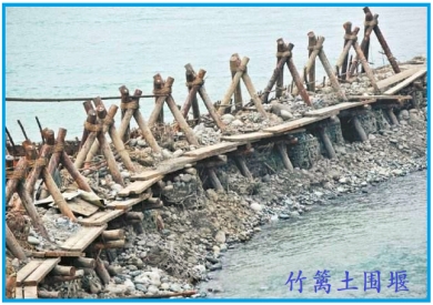 4.竹籬土圍堰:采用木樁打入水中形成框架,利用竹籬填土石來而形成的擋水結(jié)構(gòu)。