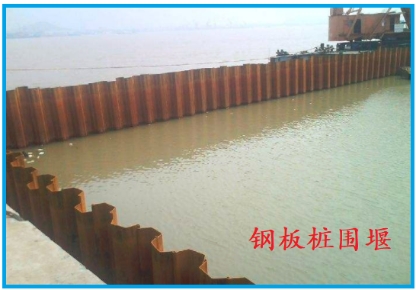 7.鋼板樁圍堰:利用鋼板樁打入到水中形成的擋水結(jié)構(gòu),鋼板樁是帶有鎖口的一種型鋼,其截面有直板形、槽形及Z形等,有各種大小尺寸及聯(lián)鎖形式。