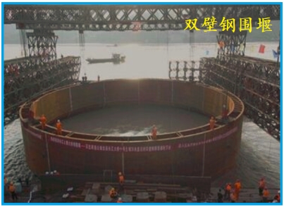 10.雙壁鋼圍堰:雙壁鋼圍堰為圓形圍堰,其堰壁鋼殼是由有加勁肋的內(nèi)外壁板和若干層水平桁架所組成,水平桁架的間距根據(jù)圍堰灌水下沉和圍堰內(nèi)抽水各階段的水頭壓力計算,為1.0~1.4m不等。堰壁底端設(shè)刃腳,以利于下沉入土。在堰壁內(nèi)腔,用隔艙板等分為若干個密封的隔艙,借助向密閉隔艙注水或抽水來控制雙壁鋼圍堰在下沉?xí)r的傾斜。