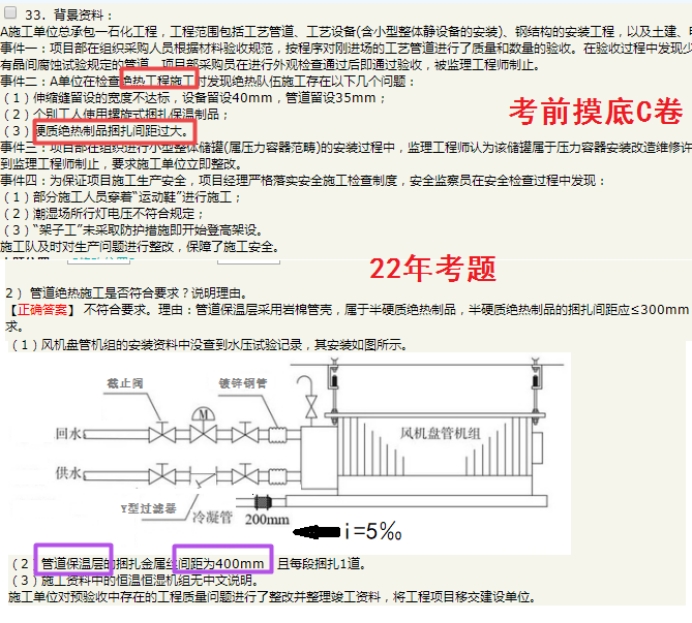 此次考試總體講:客觀題中規(guī)中矩,都是老師反復強調的知識點。主觀題實操性越來越強,圖文結合,考查考生將問題與教材理論接軌的能力。比如配電柜柜體的間隙要求?冷凝管的坡度要求——作為數(shù)字類的識圖挑錯題出現(xiàn);還有簡答型識圖題——自動扶梯的組成等。關于風機盤管的安裝技術要求,半小問超出教材考查規(guī)范內容,但對總體通過考試影響不大。