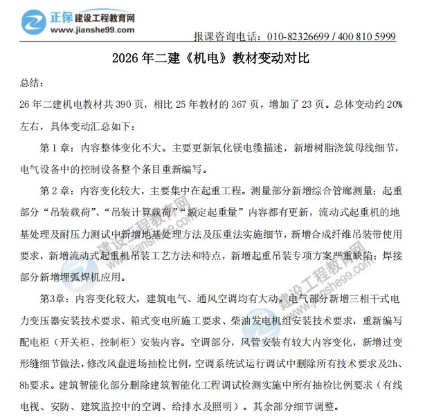 2026年一級建造師《機電工程》新教材變動對比來嘍!建設工程教育網(wǎng)教務團隊拿到教材后第一時間為大家梳理變動詳細內(nèi)容,經(jīng)核對,2026年機電工程科目整體變動約25%,教材變動內(nèi)容如下,更多變動解讀請關注1月7日20:00康仁杰老師直播間!直播入口>>