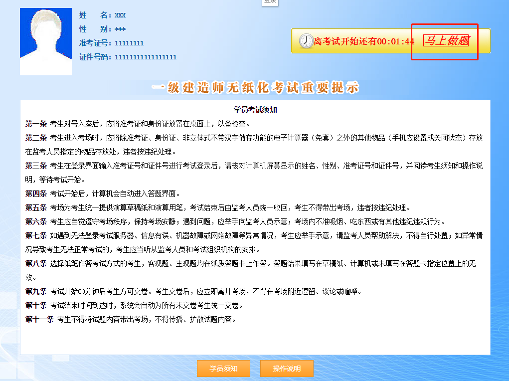 第二步:請認真閱讀??颊f明,并點擊“馬上做題”按鈕,注意答題15分鐘以上成績有效。