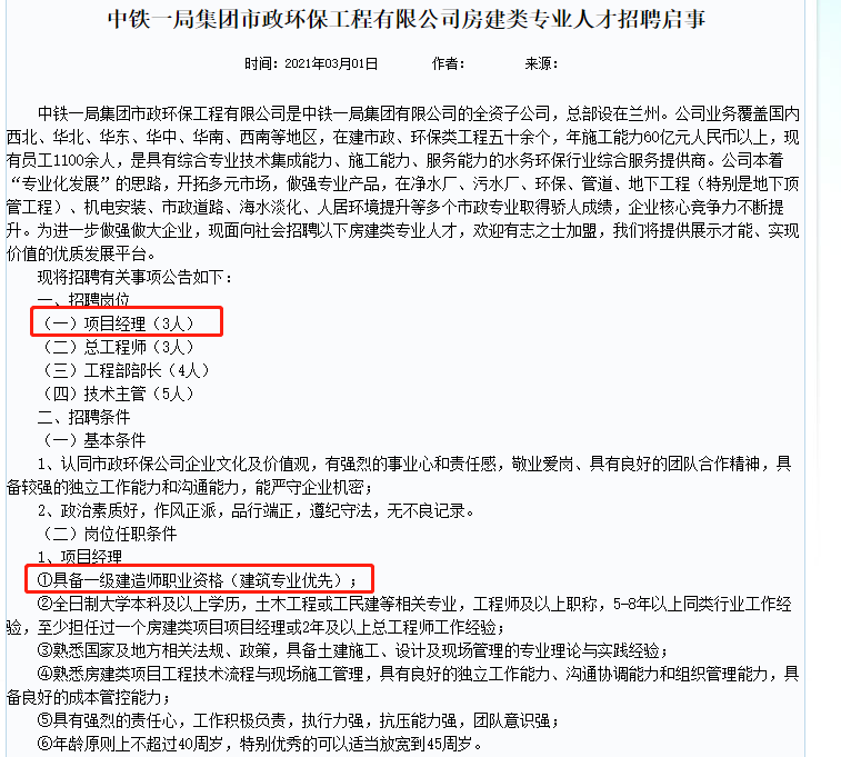中鐵一局集團(tuán)市政環(huán)保工程有限公司建類專業(yè)人才招聘啟事,招聘項(xiàng)目經(jīng)理的條件中顯示,具備一級建造師職業(yè)資格(建筑專業(yè)優(yōu)先),這也說明一建證書的重要性。