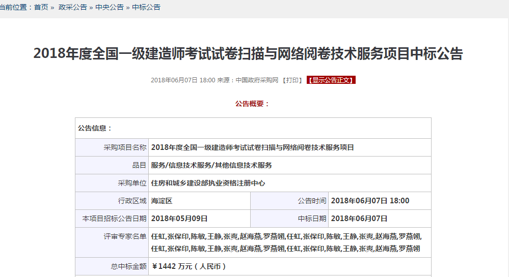 2018年一級建造師報名時間遲遲沒有公布,很多考生都很焦急,恐怕考試會有變故,無心備考。下面小建來給大家來一劑強心針,小建在中央政府采購網(wǎng)找到了《2018年度全國一級建造師考試試卷掃描與網(wǎng)絡閱卷技術服務項目中標公告》,注意是“中標公告”,這說明什么,考試一定會來的!下圖為18年試卷評分招標結果,大家可以安心備考了。