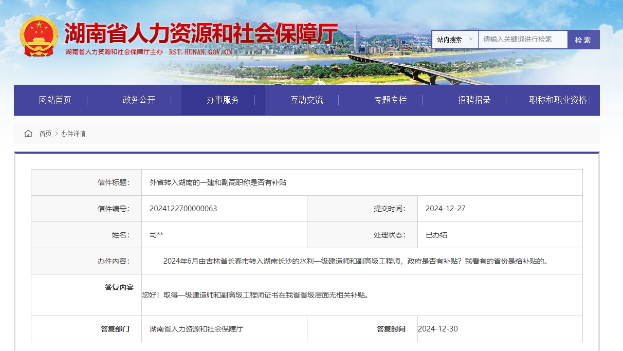 湖南省人社廳回復(fù): 取得一級建造師證書在我省省級層面無相關(guān)補(bǔ)貼