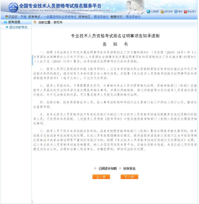 考生們選擇考試類別及考試地區(qū)后,需要仔細(xì)閱讀專業(yè)技術(shù)人員資格考試報(bào)名證明事項(xiàng)告知承諾制告知書: