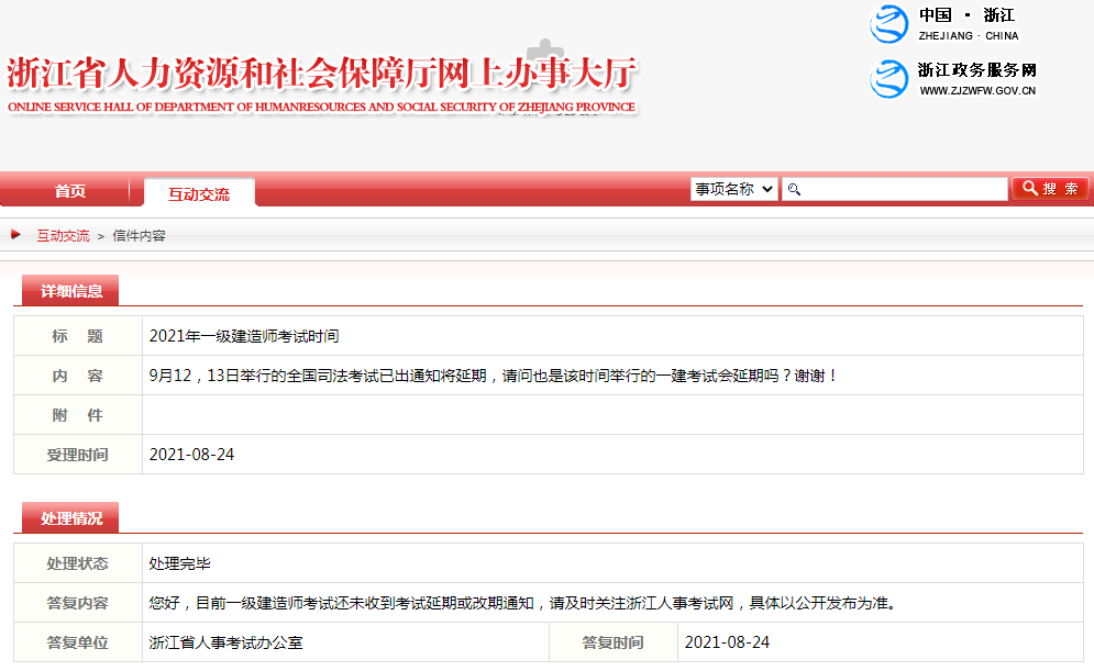 浙江人社廳關(guān)于2021年一級(jí)建造師考試是否延期的回復(fù)