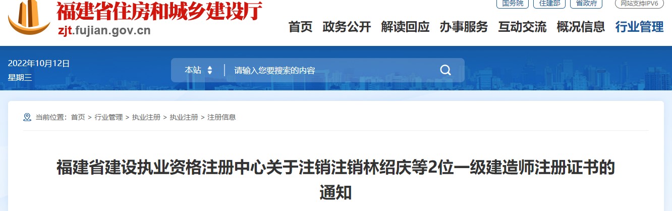 ?福建省建設(shè)執(zhí)業(yè)資格注冊中心關(guān)于注銷注銷2位一級建造師注冊證書的通知