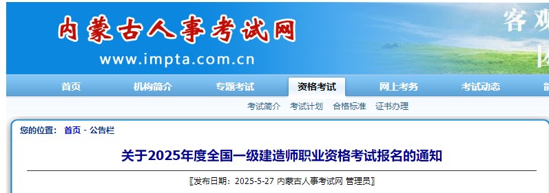 內(nèi)蒙古人事考試網(wǎng)發(fā)布關(guān)于2025年度全國(guó)一級(jí)建造師職業(yè)資格考試報(bào)名的通知,具體信息如下: