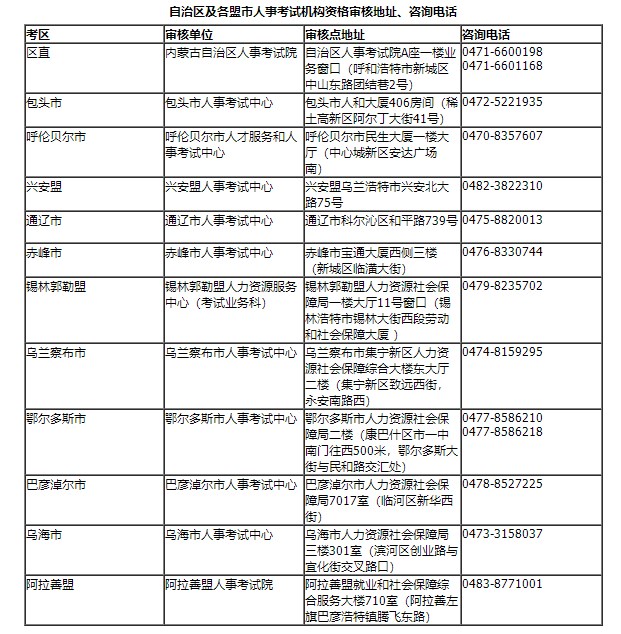 附件:自治區(qū)及各盟市人事考試機(jī)構(gòu)資格審核地址、咨詢電話