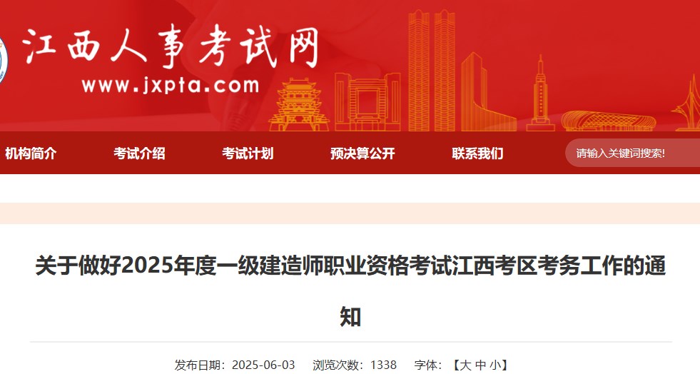 江西人事考試網(wǎng)發(fā)布關(guān)于做好2025年度一級(jí)建造師職業(yè)資格考試江西考區(qū)考務(wù)工作的通知,具體信息如下: