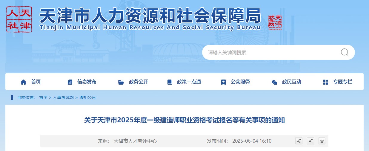 天津市人力資源和社會保障局發(fā)布關(guān)于天津市2025年度一級建造師職業(yè)資格考試報名等有關(guān)事項的通知,具體信息如下:
