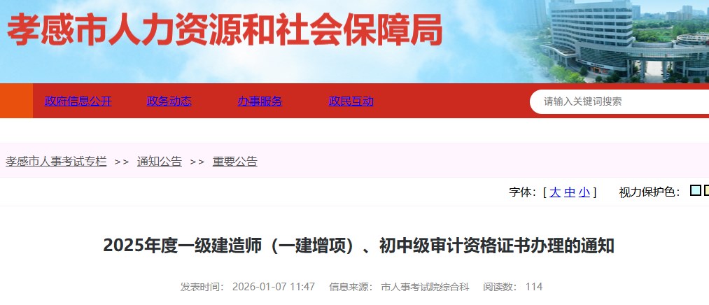 孝感市人力資源和社會(huì)保障局發(fā)布2025年度一級(jí)建造師(一建增項(xiàng))、初中級(jí)審計(jì)資格證書辦理的通知,具體信息如下: