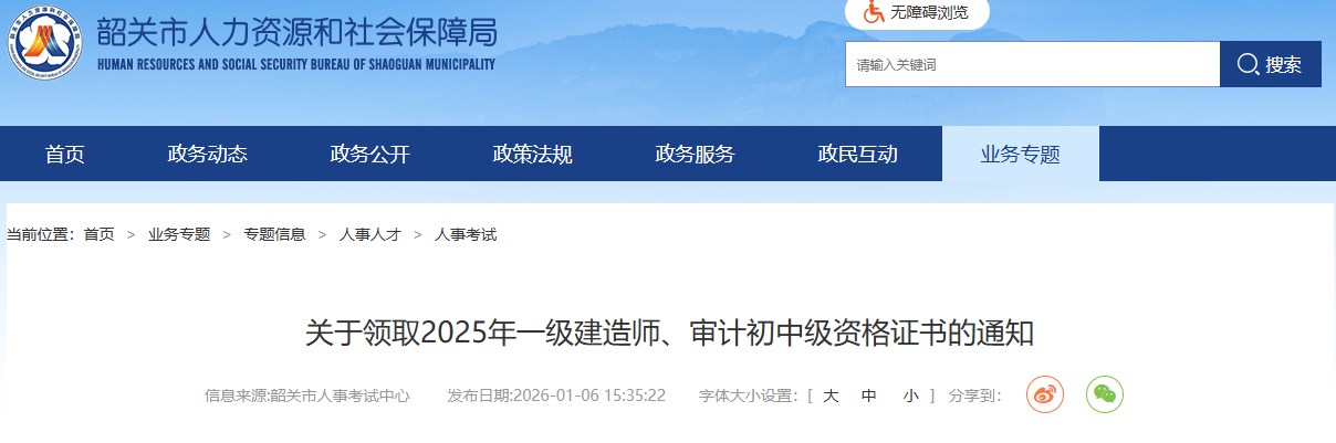 韶關(guān)市人力資源和社會保障局發(fā)布關(guān)于領(lǐng)取2025年一級建造師、審計初中級資格證書的通知,具體信息如下: