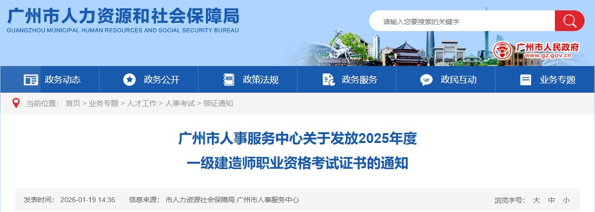 廣州市人力資源社會保障局發(fā)布廣州市人事服務(wù)中心關(guān)于發(fā)放2025年度一級建造師職業(yè)資格考試證書的通知,具體信息如下: