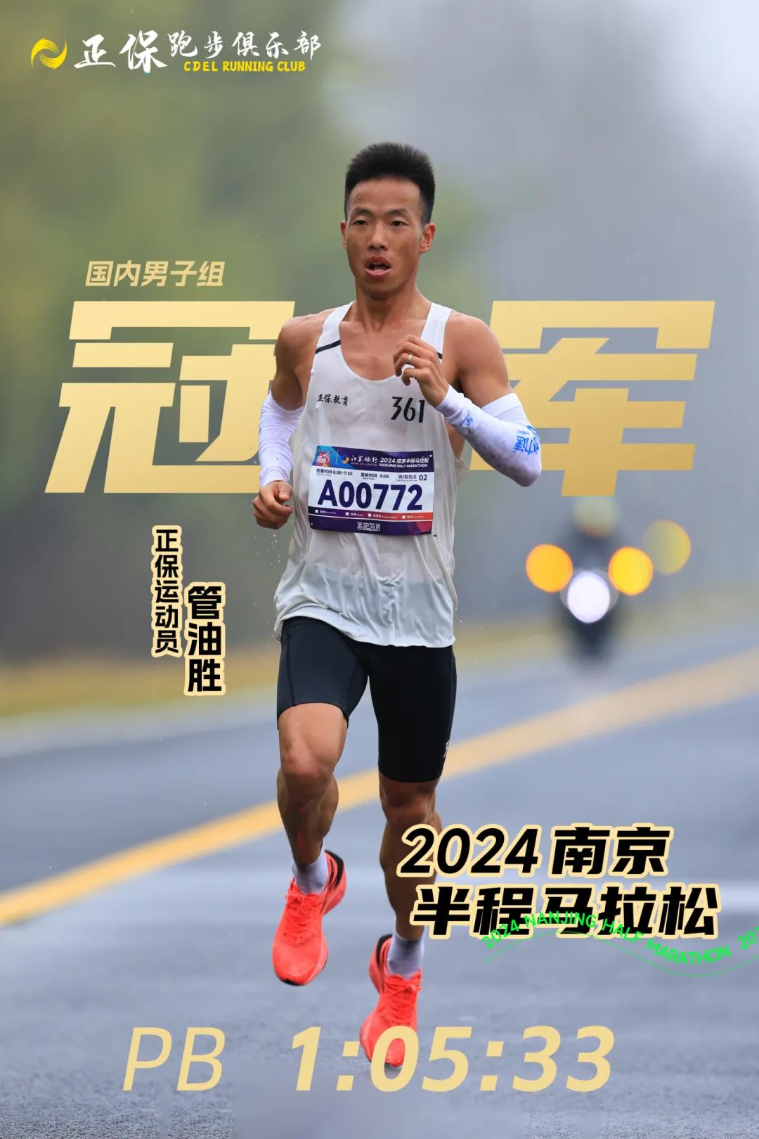 昨日(3月17日),2024南京半程馬拉松開(kāi)跑,正保運(yùn)動(dòng)員管油勝以1:05:33獲得男子組國(guó)內(nèi)冠軍,國(guó)際第四的好成績(jī)同時(shí)打破個(gè)人PB,這也是他本月的第三個(gè)冠軍,恭喜他!