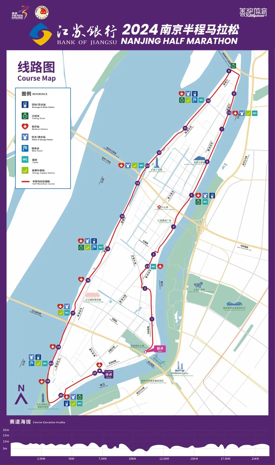 比賽路線由南京青奧森林公園南門出發(fā),環(huán)島奔跑,全長(zhǎng)21.0975公里?!澳习腭R”賽道基本規(guī)避了對(duì)城市道路交通的影響,能夠進(jìn)一步提升跑者體驗(yàn)感。同時(shí)為助力選手跑出好成績(jī),組委會(huì)對(duì)賽事起跑段和沖刺段進(jìn)行了優(yōu)化設(shè)計(jì)。選手將在環(huán)島東路上進(jìn)行前3.3公里的起跑和最后1公里的沖刺。環(huán)島東路路面寬闊,賽道最寬處達(dá)14米,更有利于選手創(chuàng)造個(gè)人PB。