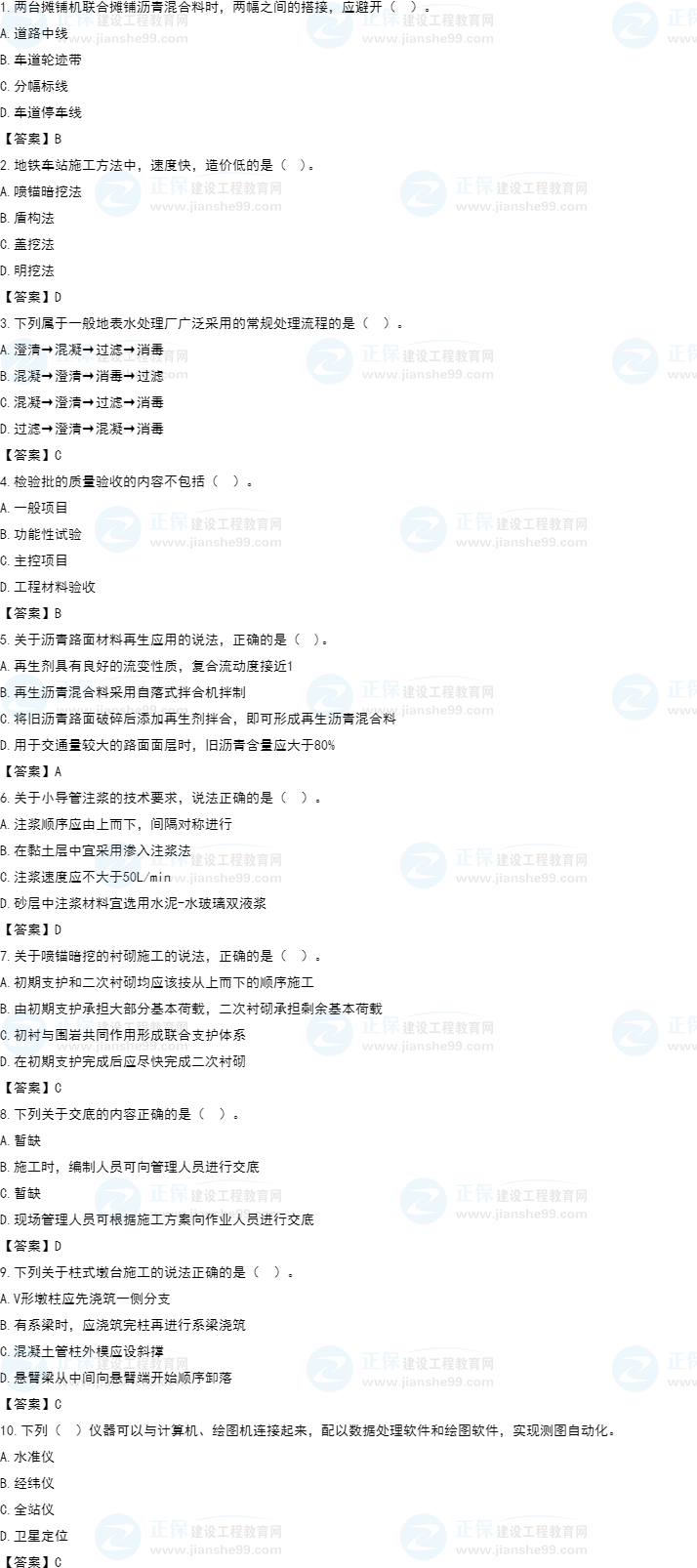 2022年一級(jí)建造師補(bǔ)考市政工程試題及答案解析1-10題。建設(shè)工程教育網(wǎng)考后將會(huì)根據(jù)學(xué)員反饋,及時(shí)匯總2022年一級(jí)建造師補(bǔ)考市政工程試題及答案解析分享給大家,并且會(huì)及時(shí)做出一級(jí)建造師答案解析,希望能為廣大一建考生朋友帶來(lái)幫助。