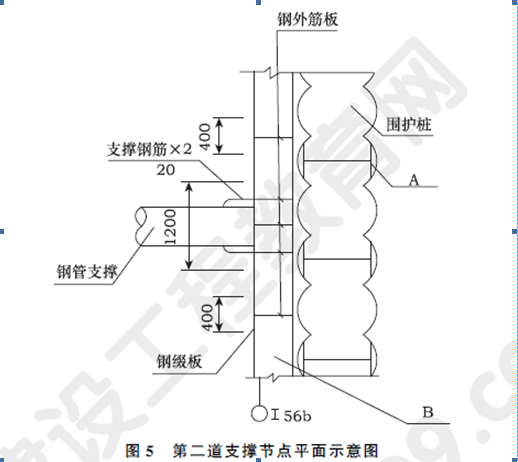 某施工單位中標(biāo)承建過(guò)街地下通道工程,周邊地下管線較復(fù)雜,設(shè)計(jì)采用明挖順作法施工,通道基坑總長(zhǎng)80m,寬12m,開挖深度10m;基坑圍護(hù)結(jié)構(gòu)采用SMW工法樁,基坑的深度方向設(shè)有2道支撐,其中第一道支撐為鋼筋混凝土支撐,第二道支撐為φ609×16mm鋼管支撐(見圖5)?;訄?chǎng)地地層自上而下依次為:2.0m厚素填土、6m厚黏質(zhì)粉土、10m厚砂質(zhì)粉土,地下水位埋深約1.5m。在基坑內(nèi)布置了5口管井降水。