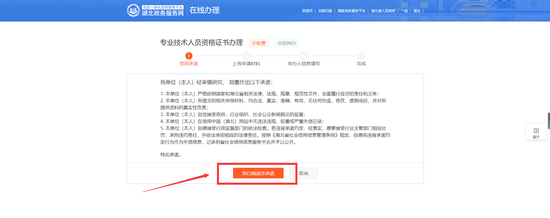 4.請認真閱讀專業(yè)技術(shù)人員資格證書辦理承諾書,確認無異議后點擊“我已閱讀并承諾”。