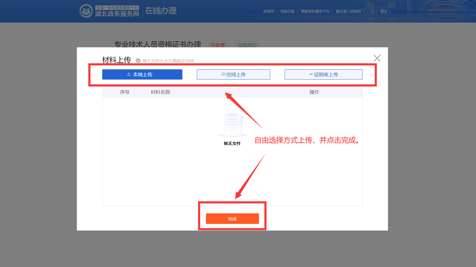 6.根據(jù)個人需要,選擇上傳方式上傳“考生證書領(lǐng)取申請表”,并點擊完成。
