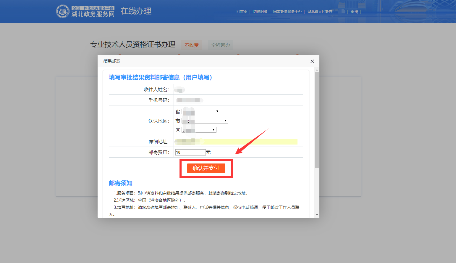 9.選擇送達地區(qū)所在省市區(qū),并填寫詳細地址(如道路、門牌號、小區(qū)、樓棟號、單元室等),系統(tǒng)會自動計算出郵寄費用,具體收費標準見界面下方“郵寄須知”;請在確認地址無誤,并對郵寄費用數(shù)額無異議后,點擊“確認并支付”。