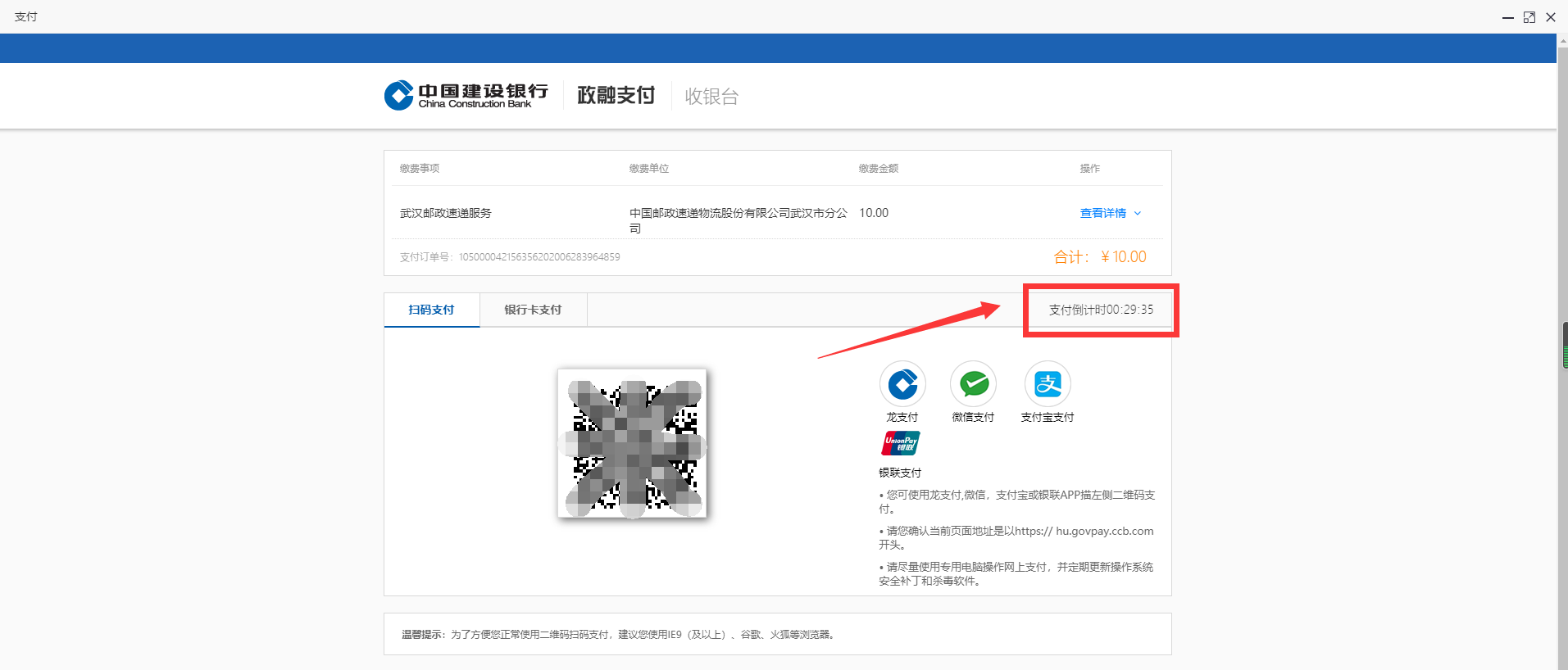 10.出現(xiàn)付款二維碼后,請在支付倒計時結(jié)束前使用微信、支付寶或龍支付掃碼支付證書郵寄費用。