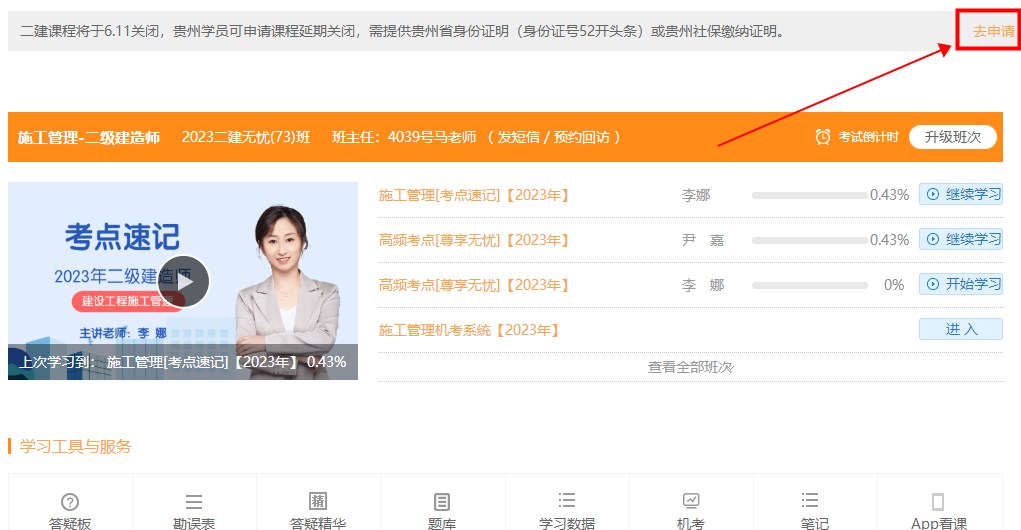 網(wǎng)校2023年二級建造師課程將于6月11日關(guān)閉,貴州考生可在我的網(wǎng)校我的家申請課程延期,我們將為貴州考生將課程延期至貴州考后一周。課程延期申請入口將于6月10日0點(diǎn)關(guān)閉,逾期無法申請。