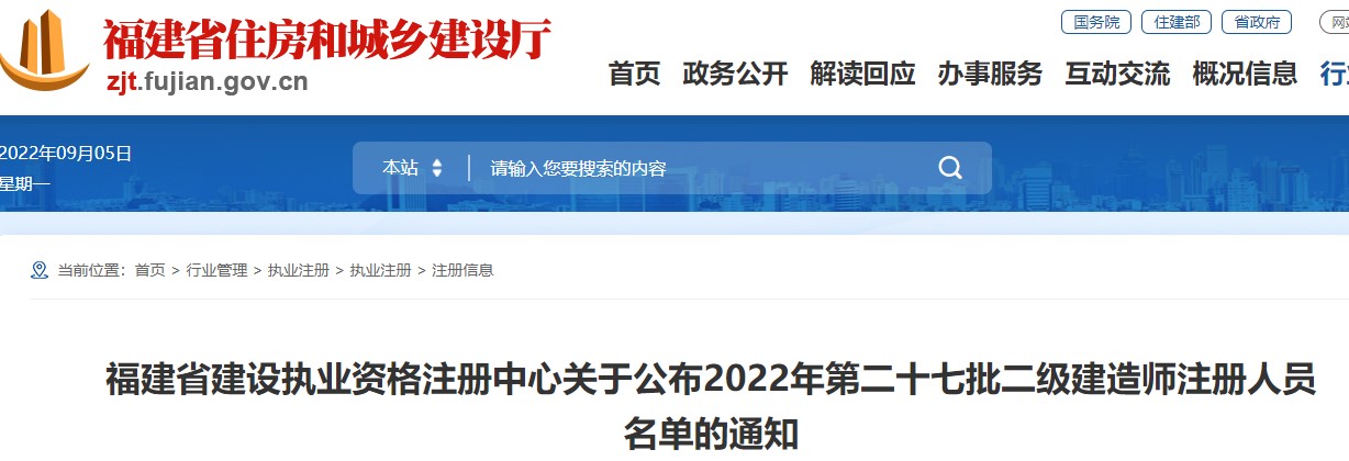福建省關(guān)于公布2022年第二十七批二級建造師注冊人員名單的通知