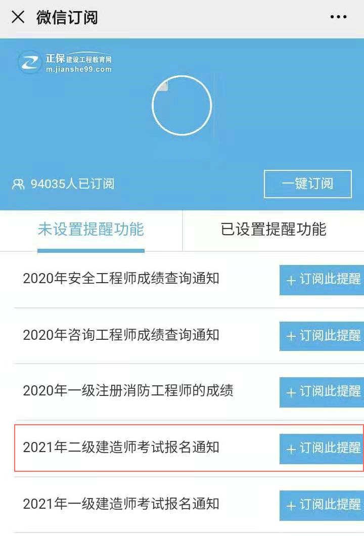 第三步:選擇“2021年二級建造師考試報名通知”-訂閱此提醒