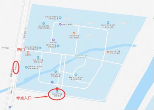 友情提示:請從揚州職業(yè)大學(xué)西門進入,由于西門離考場有一段距離,請考生盡量提早到達考場所在教學(xué)樓,可乘坐101路公交車。