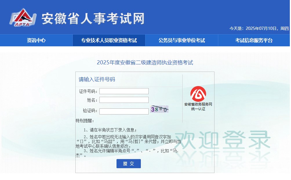 2025年安徽二級(jí)建造師成績(jī)查詢(xún)?nèi)肟冢?/strong>http://www.apta.gov.cn/ProfTech_ExamScore/ScoreLogin?eid=1355
