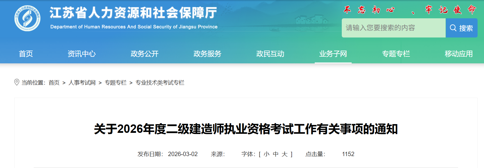 江蘇省人力資源和社會保障廳發(fā)布關(guān)于2026年度二級建造師執(zhí)業(yè)資格考試工作有關(guān)事項的通知,報名時間:2026年3月5日9:00至2 0日16:00,報名網(wǎng)站網(wǎng)址:江蘇人事考試網(wǎng)(http://jiangsu nomax.vip/tip/),繳費(fèi)時間為2026年3月5日至21日,準(zhǔn)考證打印時間:2026年5月25日至29日,考試時間:5月30日、31日,合格標(biāo)準(zhǔn):試卷滿分的60%(如有特殊情況,由長三角地區(qū)兩省一市協(xié)商劃定并另行通告),具體信息如下: