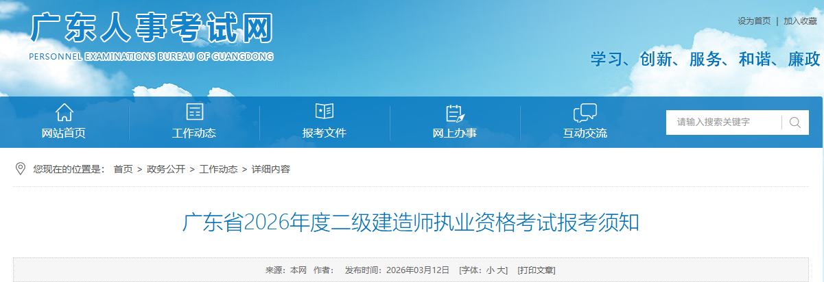 廣東人事考試網(wǎng)發(fā)布廣東省2026年度二級建造師執(zhí)業(yè)資格考試報(bào)考須知,報(bào)名時間:2026年3月16日9:00-3月26日17:00,報(bào)名網(wǎng)址:廣東人事考試網(wǎng)(http://rsks.gd.gov.cn),繳費(fèi)時間:2026年3月16日9:00-3月27日17:00,準(zhǔn)考證打印時間:2026年5月26日9:00-5月29日17:00,考試時間:5月30日、31日,考試形式:計(jì)算機(jī)化考試,2026年度二級建造師執(zhí)業(yè)資格考試各科目合格標(biāo)準(zhǔn)均為試卷卷面總分的50%。如遇特殊情況,需要變更調(diào)整合格標(biāo)準(zhǔn)的,另行通告。具體信息如下:
