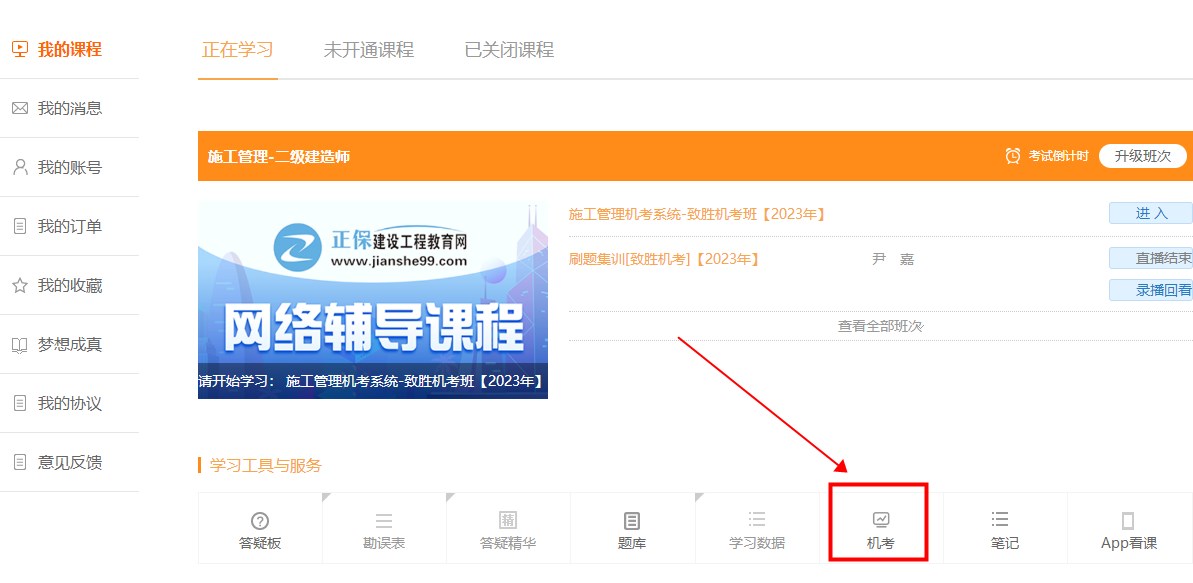 (2)找到下方“學(xué)習(xí)工具與服務(wù)”,點擊“機考”按鈕即可進行機考模擬系統(tǒng)