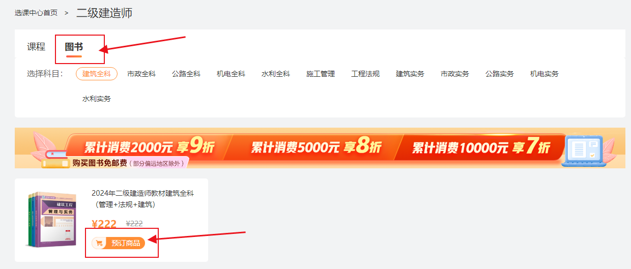 移動端(手機、平板等)預定/購買方式:建設工程教育網(wǎng)(m.jianshe99.com)首頁→頁面底部選擇【購課】→選擇【二級建造師】→切換選擇【圖書】