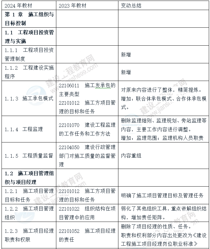 2024年二級建造師施工管理教材變動情況表預覽