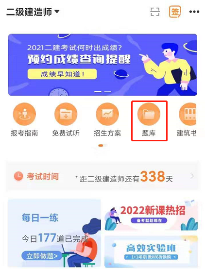 1、登錄建設工程教育網(wǎng)APP首頁,選擇“二級建造師”,找到“題庫”。