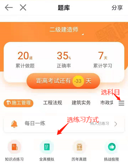 您可以選擇每日一練、鞏固練習、全真模擬、歷年試題、挑戰(zhàn)極限多種練習方式做題。