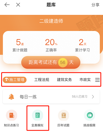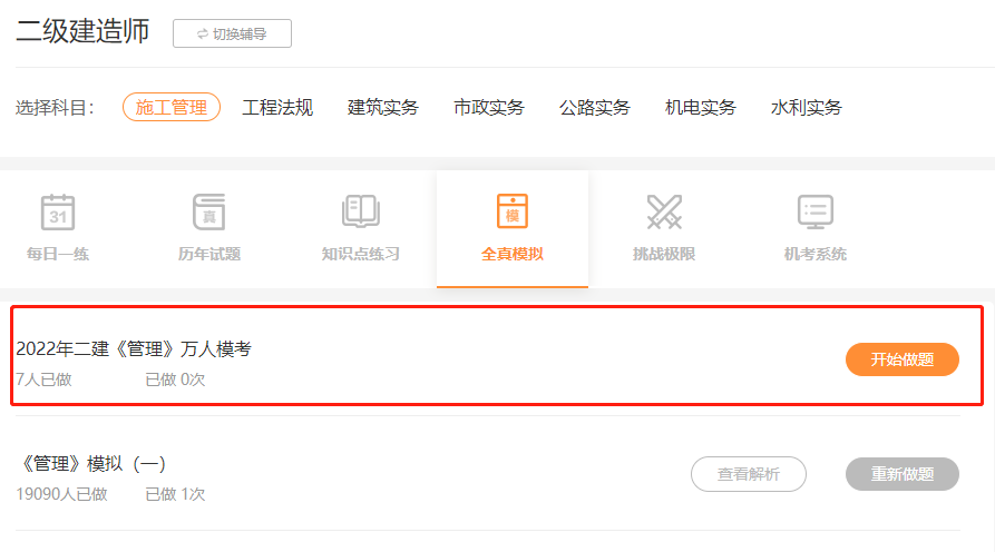 2、切換輔導(dǎo),選擇二級建造師,選擇全真模擬即可。