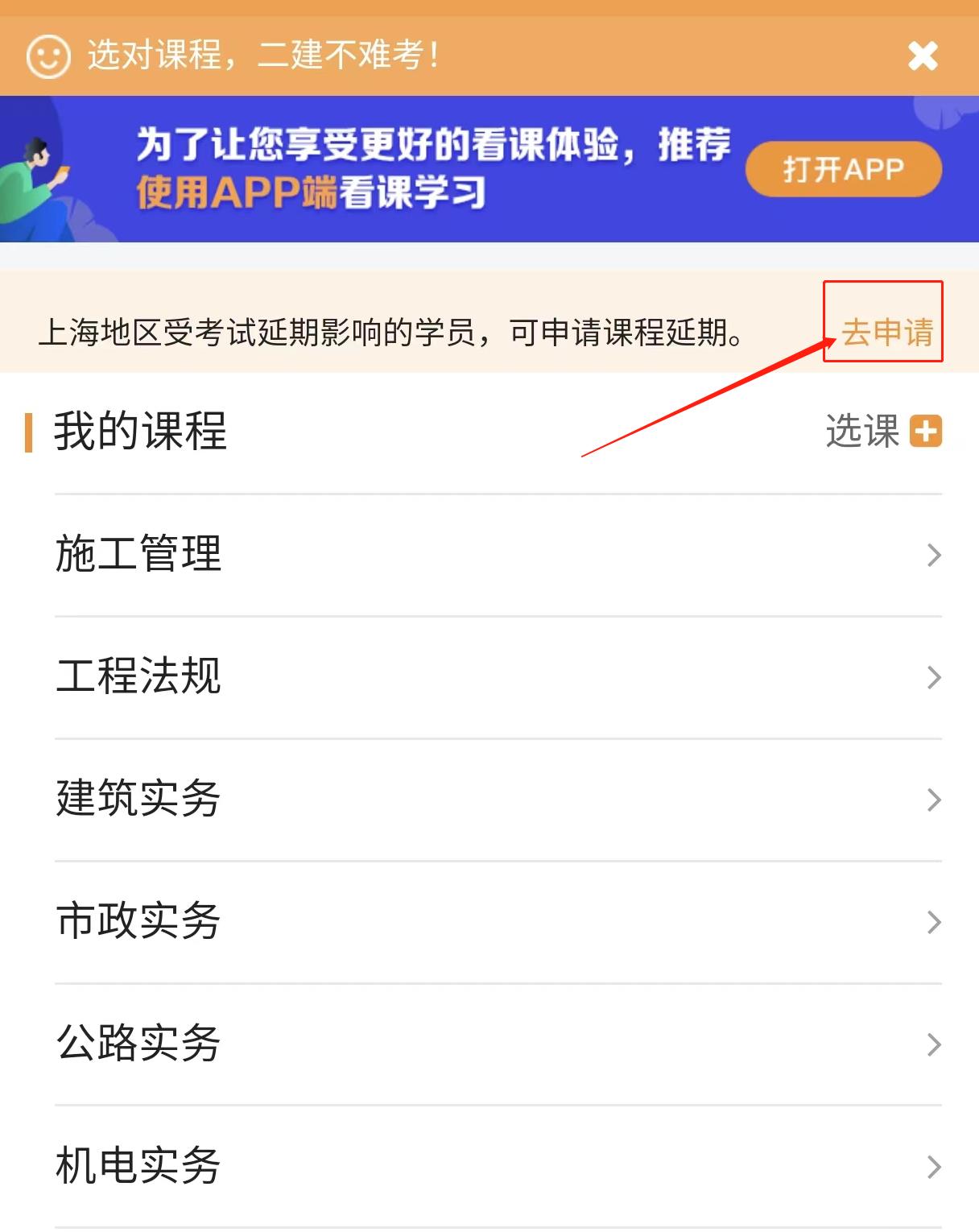 之前在網(wǎng)校報過2022年二級建造師課程的上海考區(qū)的同學(xué),可以申請課程延期,申請時間為:4月27日-5月31日,入口在“我的網(wǎng)校我的家”,同學(xué)們及時提交申請,不要錯過了時間。