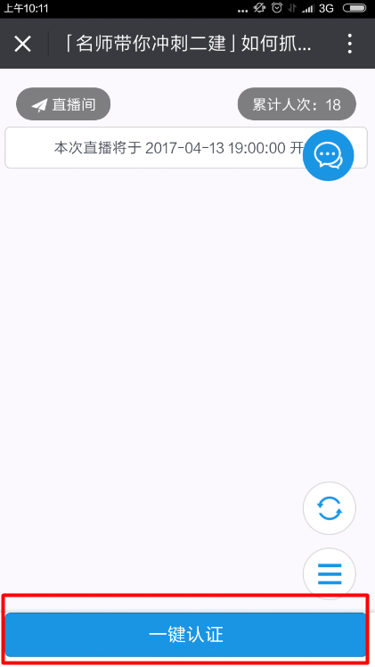 步驟3: 點擊“進入”按鈕進入“二建考前沖刺”直播間。(第一次進入,點擊頁面下方“一鍵認證”)