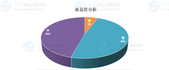 建設(shè)工程教育網(wǎng)對整體題目難易程度進(jìn)行了劃分,其中劃定為“難”的是屬于歷年出題頻率很低不容易得分的考點(diǎn),通過下圖可以看出難題并不是很多,根本影響不到通過成績,并且“易”和“中”難度等級的百分比例相差不多。