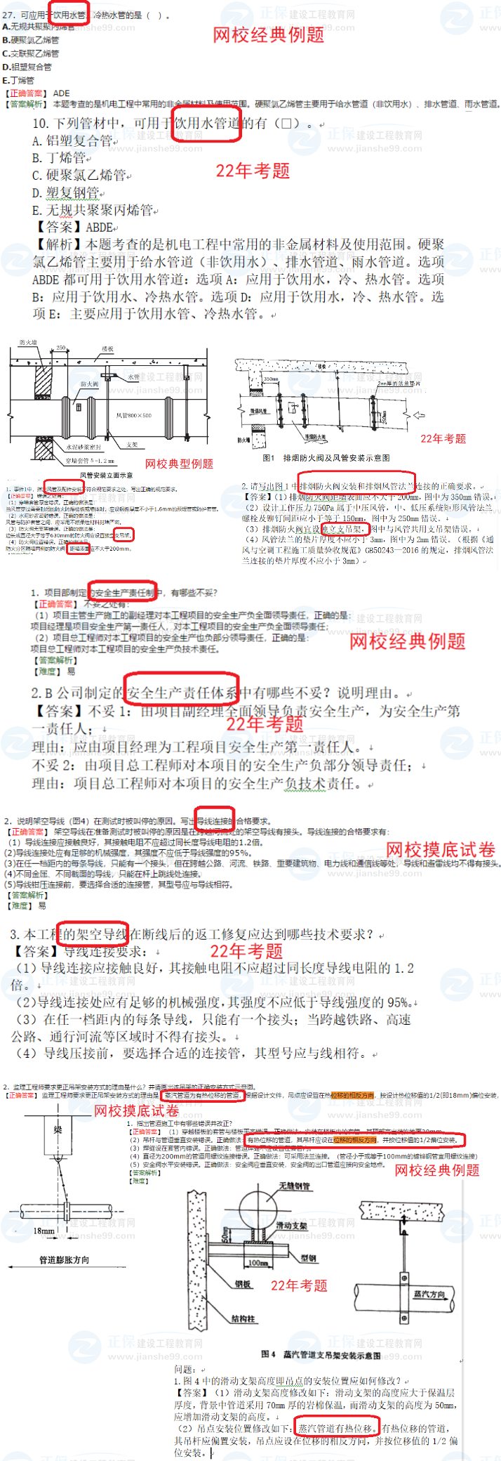 第一套(1天半正常試卷):防火閥及風(fēng)管安裝識圖挑錯題、支吊架安裝識圖挑錯題、架空線路的施工技術(shù)問答題、金屬梯架接地保護(hù)導(dǎo)體連接點(diǎn)的設(shè)置;噴灑頭安裝識圖挑錯題(超綱);