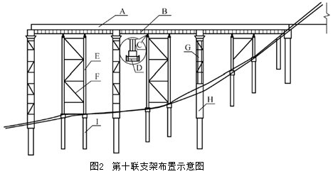 因第九聯(lián)橋墩墩身較高,移動(dòng)模架采用橋下組拼、整體垂直提升安裝方案,第十聯(lián)箱梁待隧道貫通后采用樁柱梁式支架(第十聯(lián)支架布置示意圖見(jiàn)圖2)施工,由此造成工期推遲一個(gè)月。上述方案上報(bào)相關(guān)單位并經(jīng)批復(fù)后開(kāi)始施工,根據(jù)相關(guān)規(guī)定,施工單位提出了以下索賠要求: